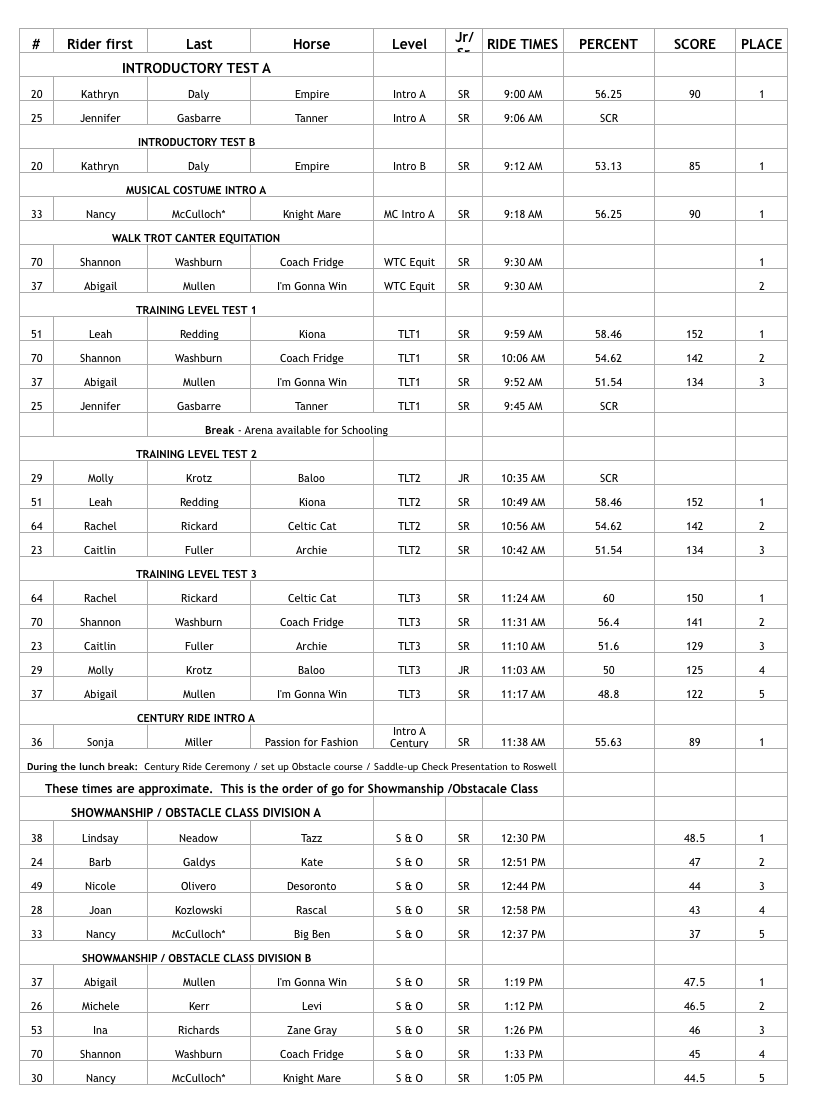 Dressage Test Results and Horse Trials Results