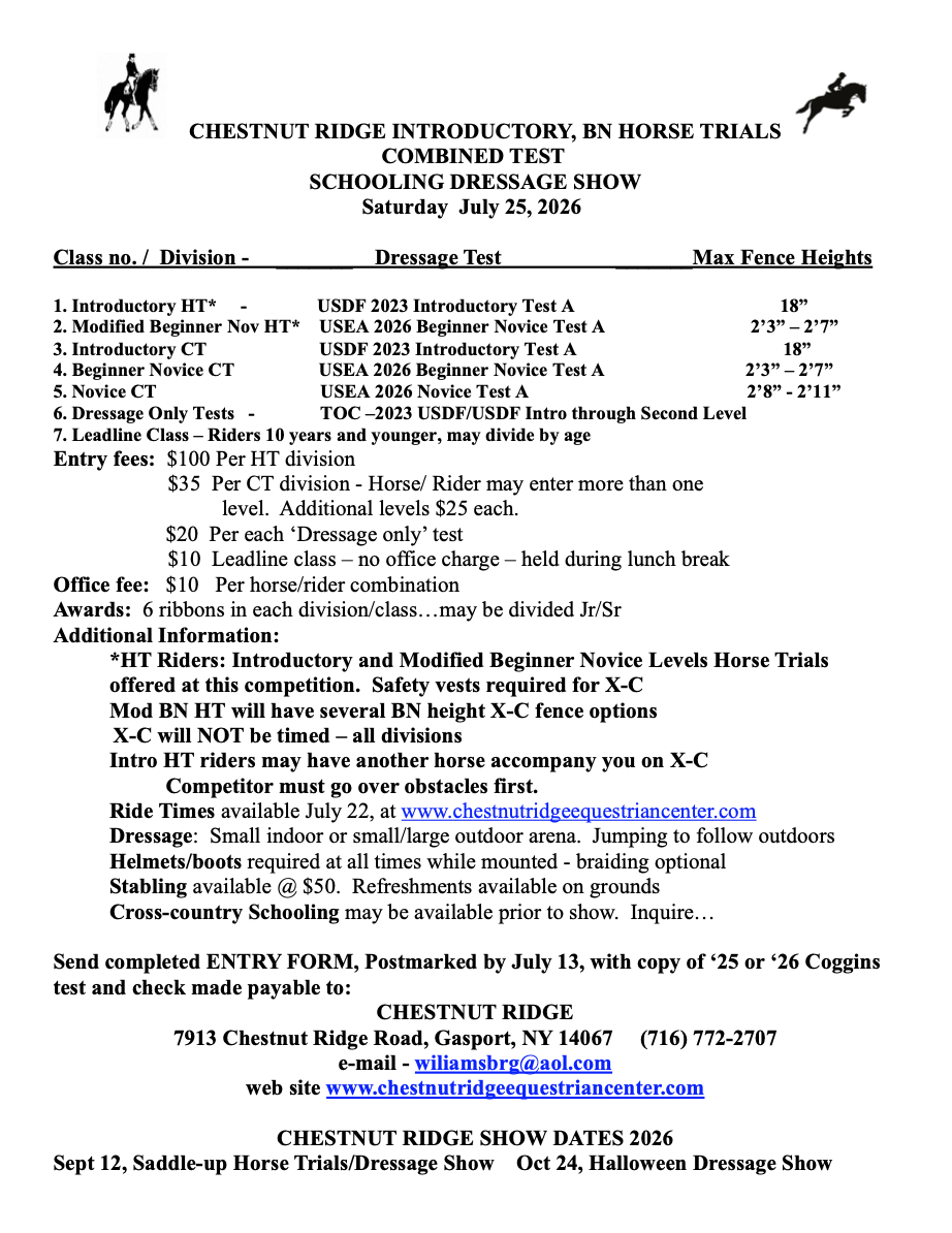 Chestnut Ridge's first show of the year! Offering Introductory, Beginner Novice, Novice and Training Combined Test Divisions, as well as Dressage Only, and Jumper Only classes.